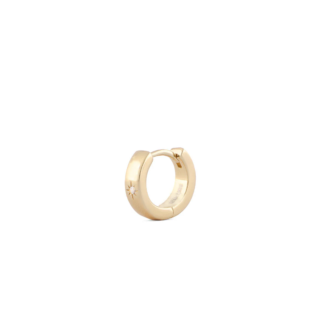 The Asteria Earring is a classic shape featuring a cubic zirconia in a star setting. The earring is made from a Gold Plated Sterling Silver huggie hoop, with a gold gauge.