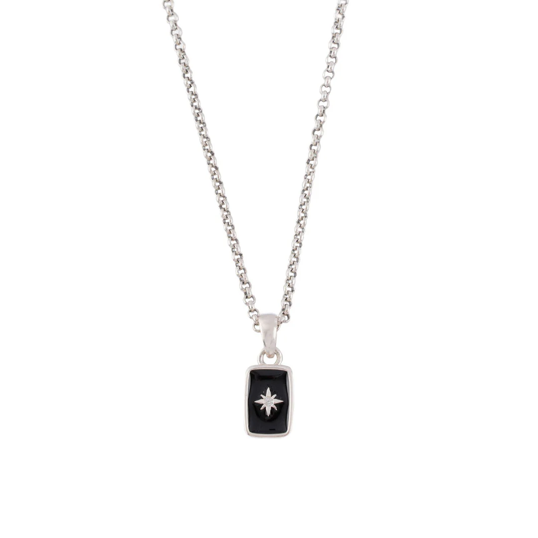 The necklace is a minimal design with black enamel & a cubic zirconia set in an 8 point star. The design was inspired by the idea of a black hole, an empty abyss with a bright star shining through the darkness.