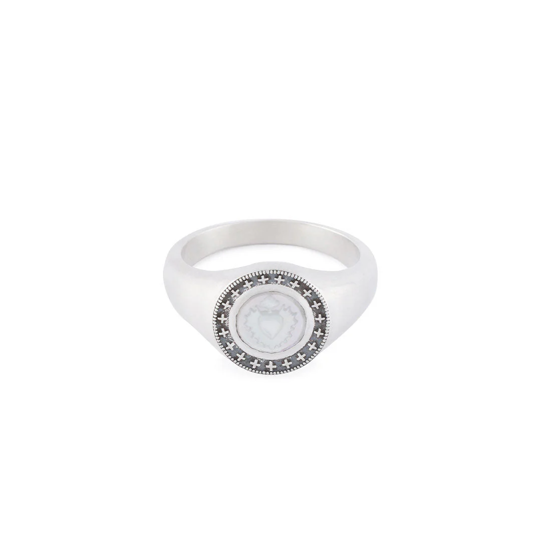 The Silver Ambrose Ring is a round shaped ring featuring the sacred heart engraved into a white shell stone. The ring is made from 925 Sterling Silver, and is stamped verifying its quality.