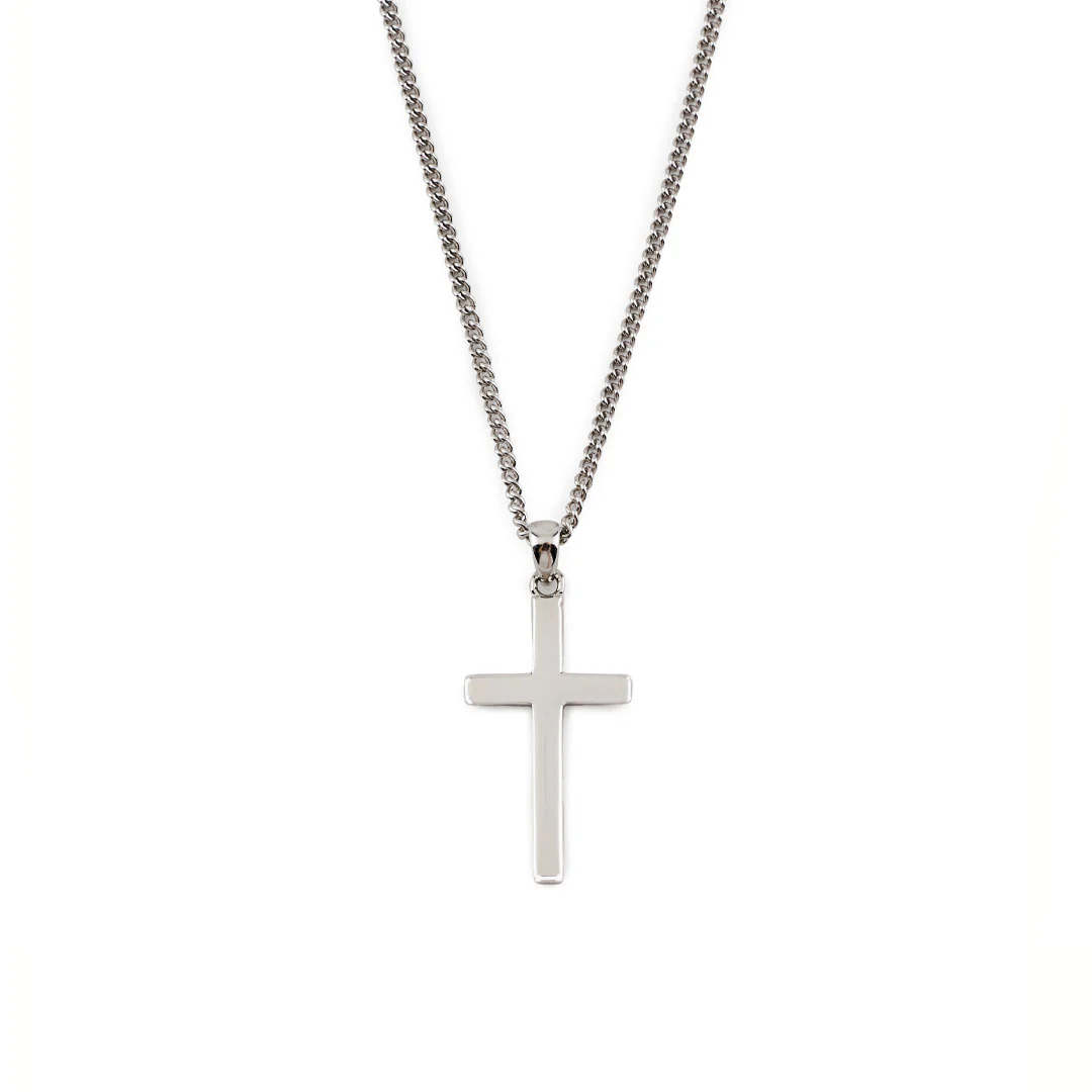 An iconic Cross symbol pendant hangs on a slim 2mm curb chain, which is available in 2 chain lengths which can be adjusted from 48-54cm or 60-69cm and fastens with a Sterling Silver lobster clasp. The necklace is finished with a rhodium plating, meaning that it has a polished, high shine look and will slow down the oxidization process.